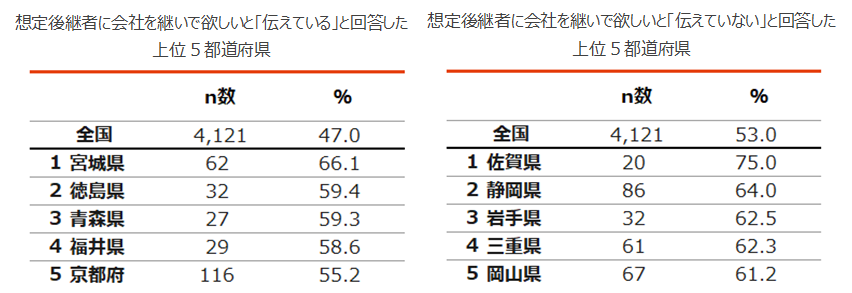 都道府県別に回答率を見ると、「伝えている」は「宮城県」(66.1%)、「伝えていない」は「佐賀県」(75.0%)が最も高い結果となりました。佐賀県は、経営者ご本人が突然亡くなったり、長期間働けなくなったりした場合の従業員の気持ちや行動として「廃業を検討する」と回答した県でも1位になっており、廃業する可能を考え、想定後継者に会社を継承して欲しいと伝えていないとも言えそうです。