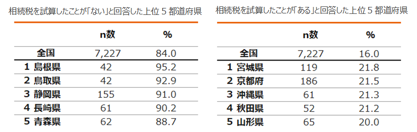 各項目の回答率を都道府県別に見ると、相続税を試算したことが「ない」は「島根県」(95.2%)、「ある」は「宮城県」(21.8%)が最も高い結果となりました。