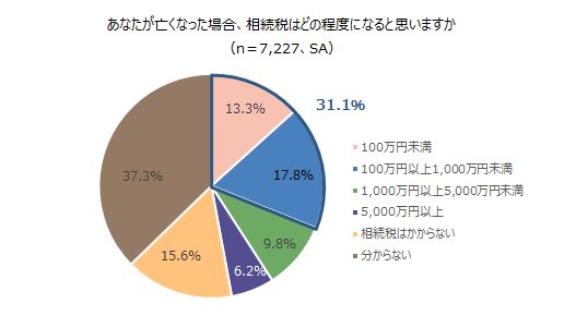 中小企業経営者7,227名に、経営者ご本人が亡くなった場合、相続税がどの程度になると思うか聞いたところ、13.3%が「100万円未満」、17.8%が「100万円以上1,000万円未満」と回答し、相続税が1,000万円未満なのは約3割(31.1%)でした。一方で、「5,000万円以上」という回答は6.2%でした。