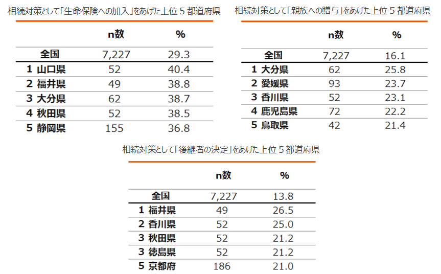 各項目の回答率を都道府県別に見ると、「生命保険への加入」は「山口県」(40.4%)、「親族への贈与」は「大分県」(25.8%)、「後継者の決定」は「福井県」(26.5%)が最も高い結果でした。