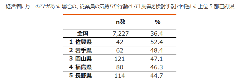 中小企業経営者に万一のことがあった場合の従業員の気持ちや行動として、「廃業を検討する」が最多で36.4%。都道府県別では佐賀県が最も多く、半数以上(52.4%)にものぼる