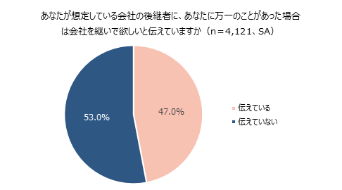 また、想定している会社の後継者がいる4,121名に、想定している会社の後継者に、万一の場合は会社を継いで欲しいと伝えているか聞いたところ、「伝えている」が47.0%、「伝えていない」が53.0%という結果になり、半数以上が会社を継いで欲しいと伝えていない実態が明らかになりました。