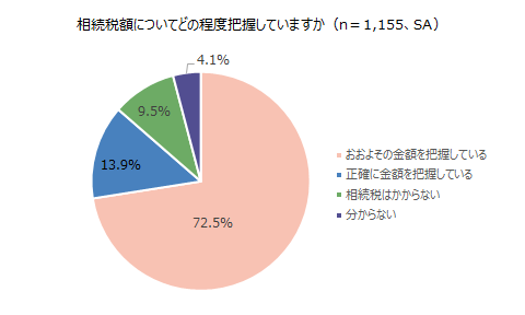また、相続税を試算したことが「ある」と回答した1,155名に、相続税額についてどの程度把握しているか聞いたところ、72.5%が「おおよその金額を把握している」、13.9%が「正確に金額を把握している」と回答しました。
