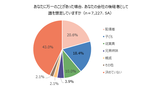 中小企業経営者7,227名に、会社の後継者として誰を想定しているか聞いたところ、最も多かったのは「配偶者」(20.6%)で、次いで「子ども」(18.4%)、「従業員」(10.0%)でした。