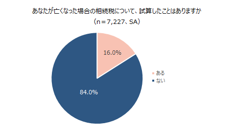 中小企業経営者7,227名に、相続税を試算したことがあるか聞いたところ、8割以上(84.0%)が「ない」と回答し、「ある」は2割未満(16.0%)にとどまりました。