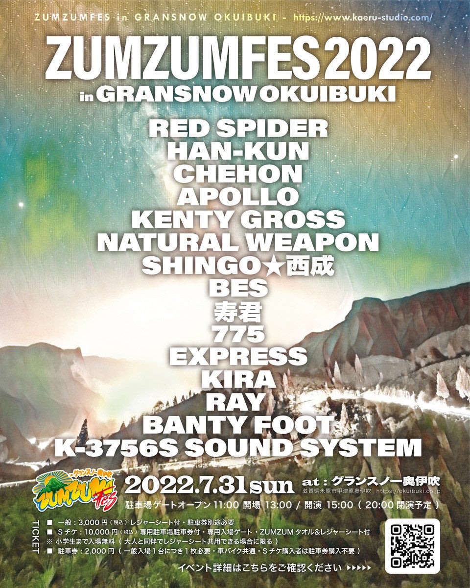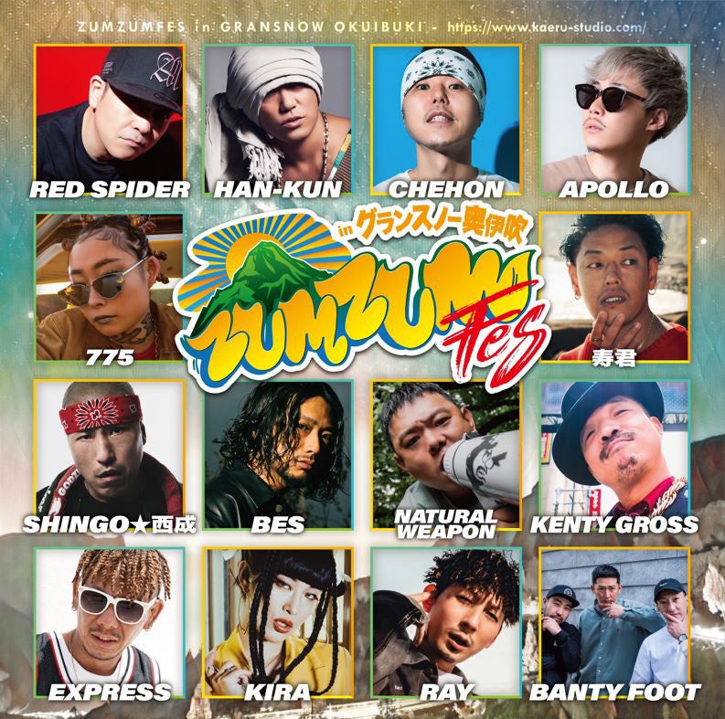 「HAN-KUN」feet湘南乃風「RED SPIDER」「CHEHON」他、「豪華アーティスト14組」がやって来る。「野外音楽フェスティバル」!「ZUMZUM FES in グランスノー奥伊吹」をグランスノー奥伊吹で開催。
