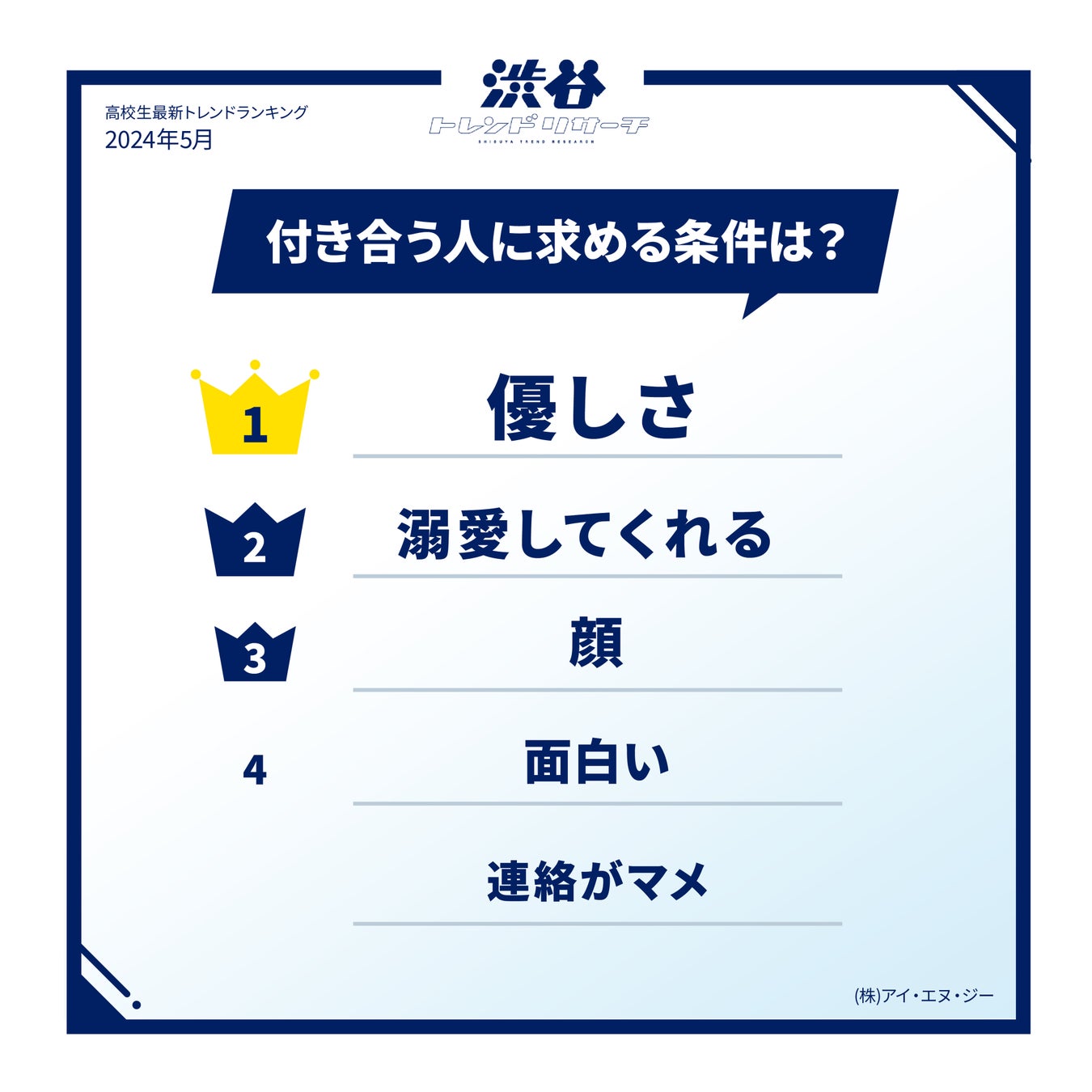 渋谷トレンドリサーチは、回収したデータに基づき、渋谷を拠点に運営するINGteens高校生メンバーの生の声を反映し、どこよりもリアルで鮮度の高い最新の高校生トレンドを発表します。