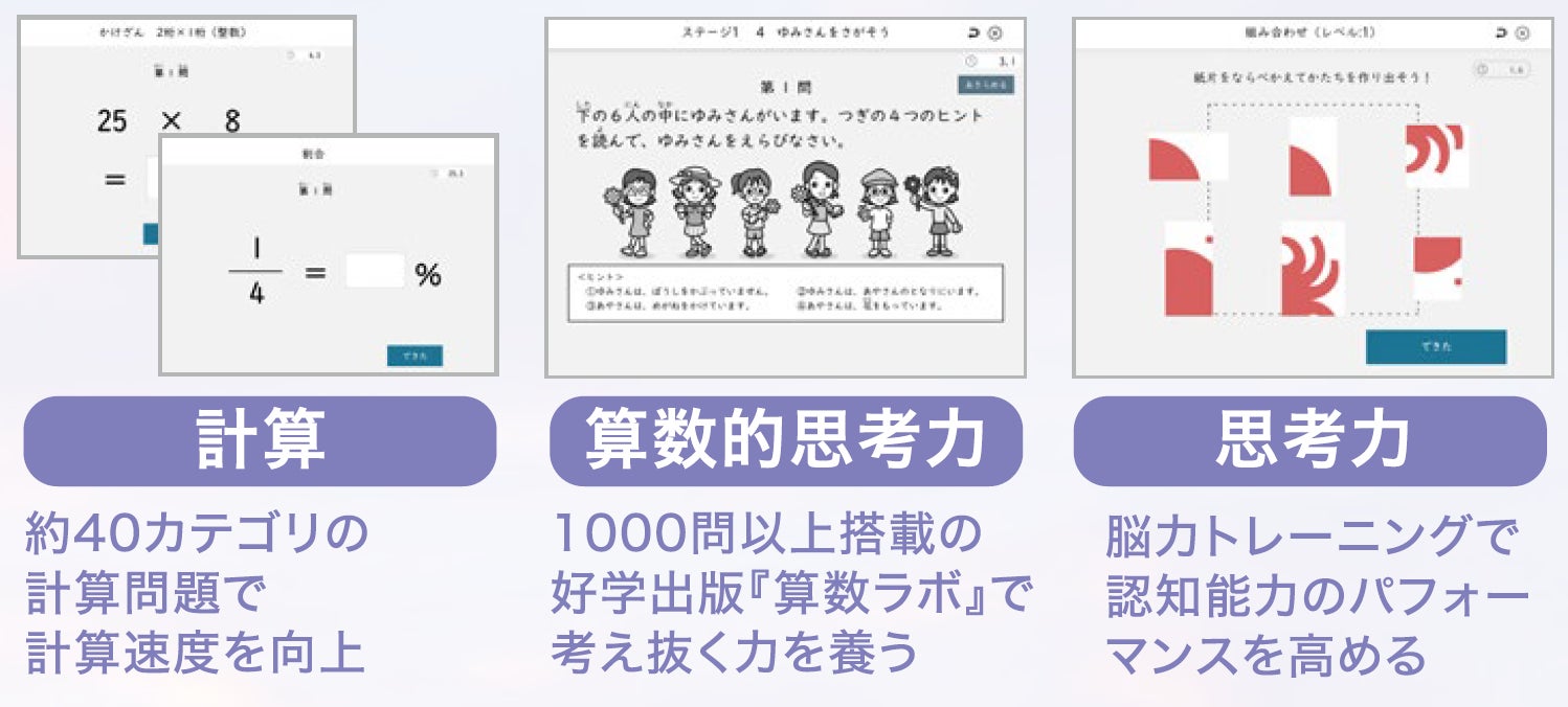 ⇒株式会社好学出版『算数ラボ』から搭載された1000問以上の思考力問題に取り組むことで、文部科学省が学習指導要領にて提唱しているような、柔軟な思考力が必要とされる問題を解く際に役立ちます。