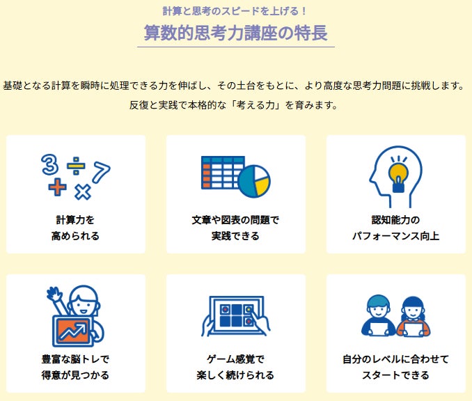 弊社に在籍している元数学講師たちが力を結集し、[算数・数学を教える先生方が、算数・数学の授業の前に、子どもたちに持っていて欲しいと思う力を鍛えられるコンテンツ]をコンセプトに開発したものが、『算数的思考力講座』です。