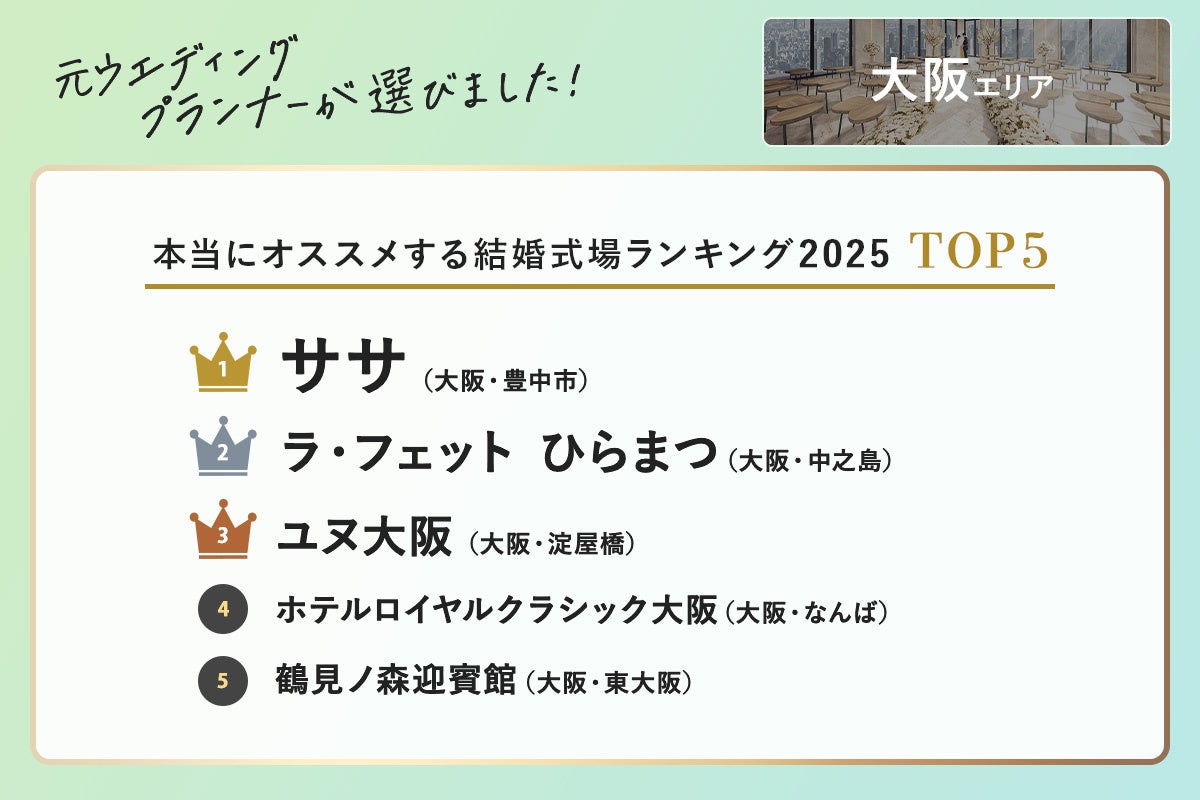 元ウエディングプランナーが選ぶ「本当にオススメする結婚式場ランキング<2025関西版>」を発表!“令和婚”らしい自由度とセンスを両立した、自分たちらしさが叶う式場が上位にランクイン