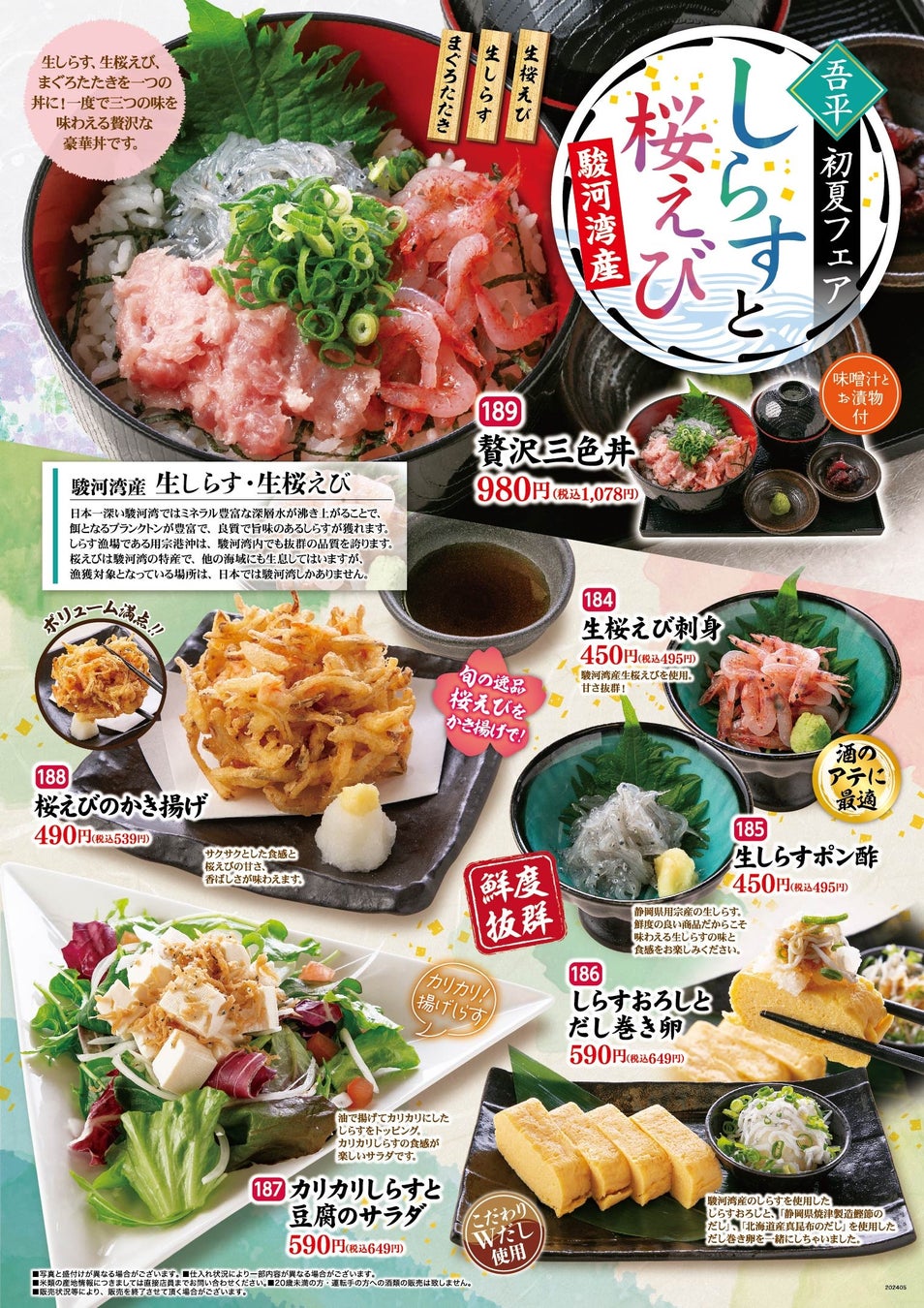 5/15(水)~「くつろぎ」の空間で楽しむ居酒屋「とりあえず吾平」にて初夏の「しらすと桜えび」フェア開催!