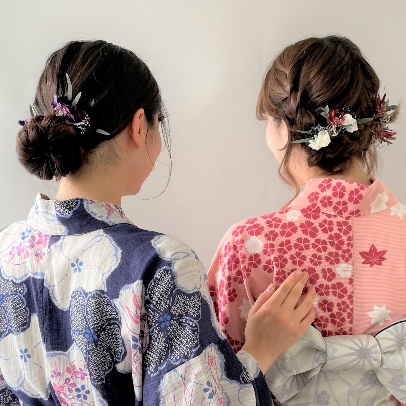 持ち運びにも便利なケース入り。3 個をまとめてコサージュのようにしたり、一つ一つ分けてスタイリングすることもできます。ヘアアクセサリーと扇子アクセサリーに分けたり、友人やパートナーとシェアして楽しむことも可能です。普段は小さな花瓶等に飾っても楽しめます。