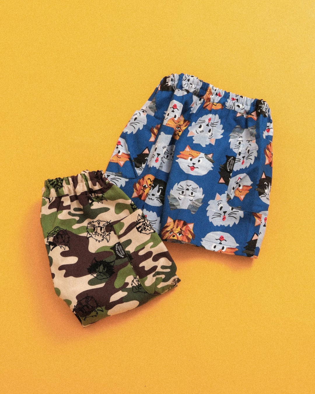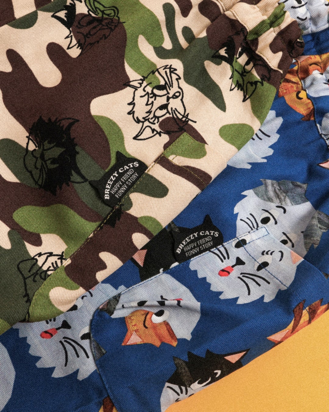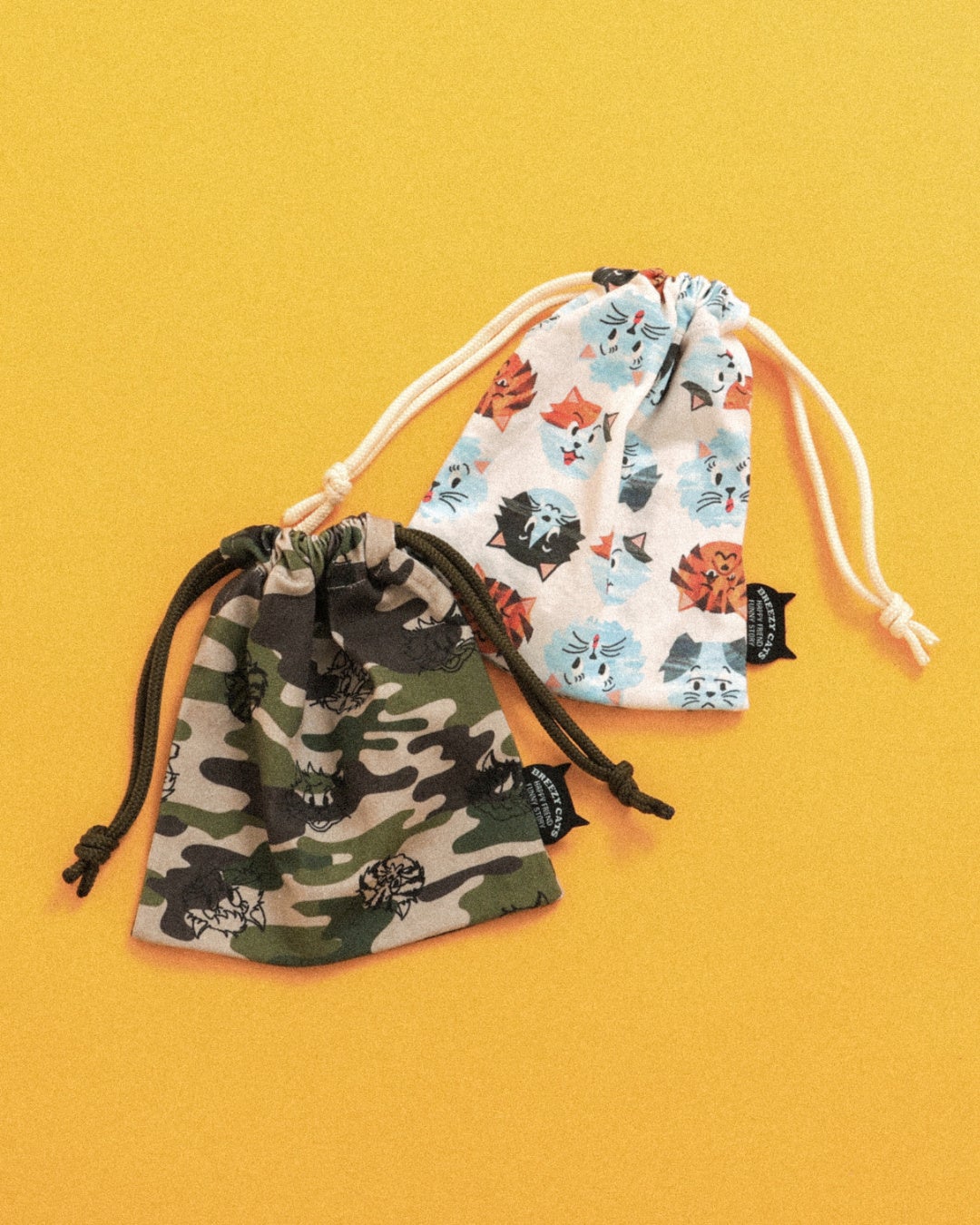 カーキはトレンドのレオパード柄にネコたちの線画デザイン。ネイビーはひとつひとつ表情の違うネコたちが全面に散りばめられた主役の1枚。