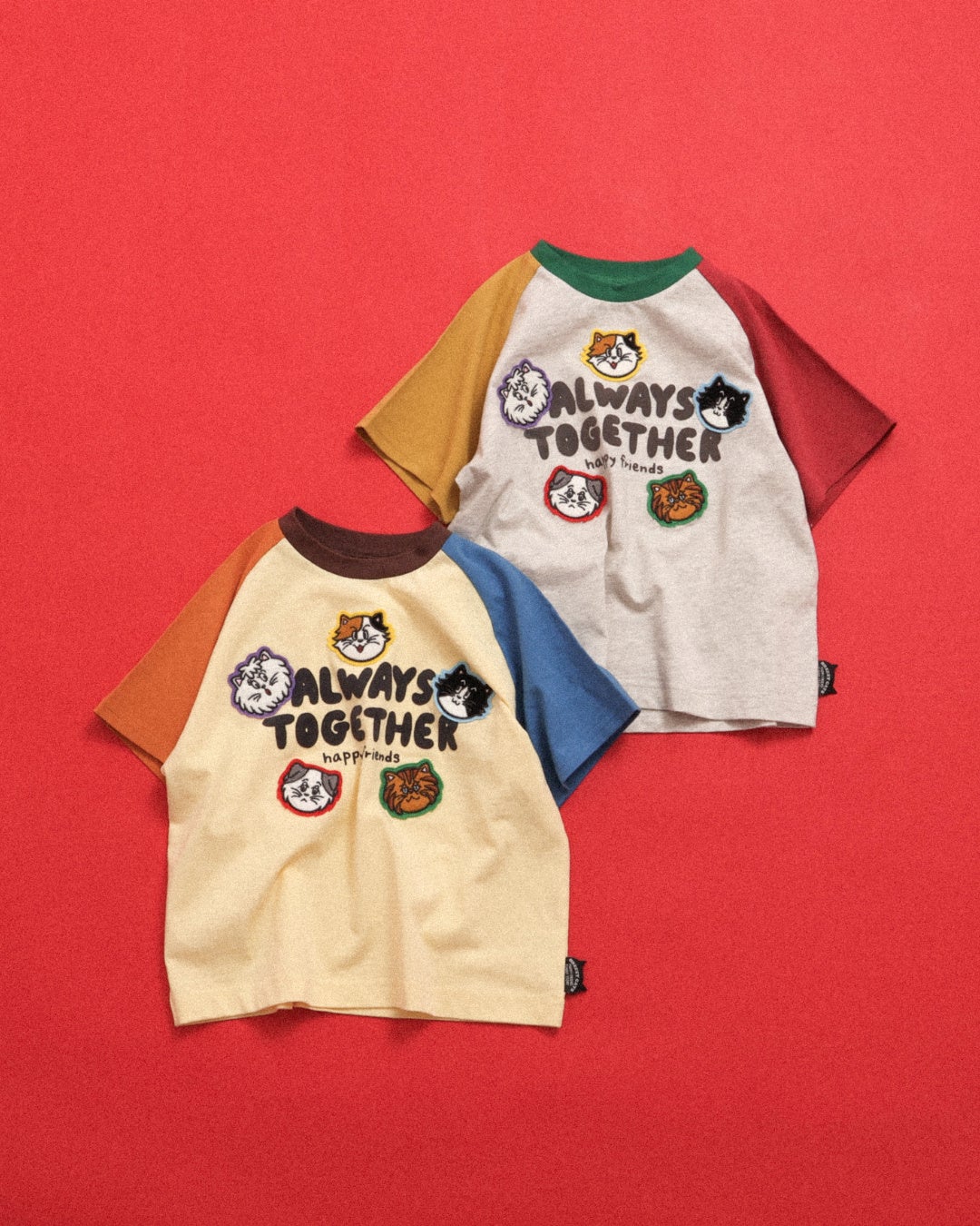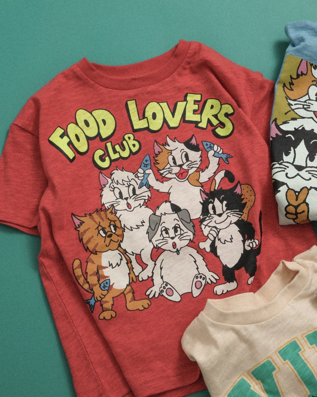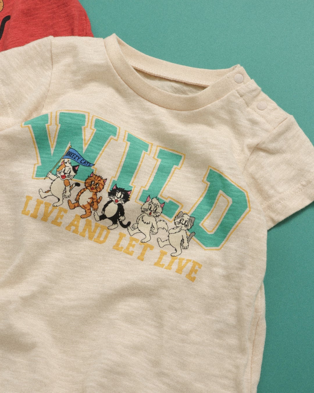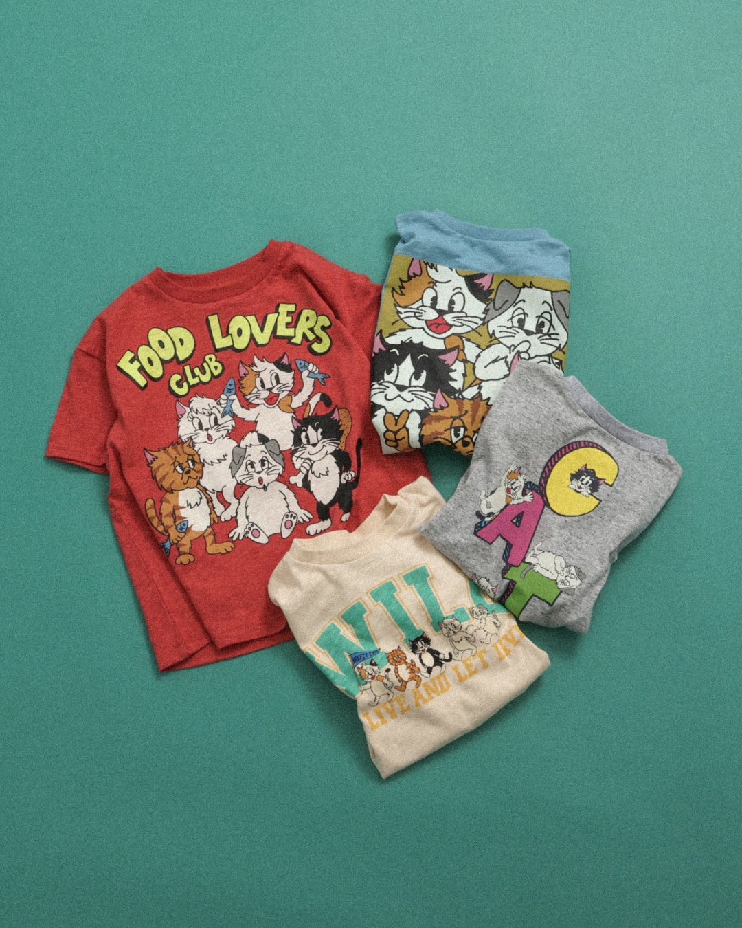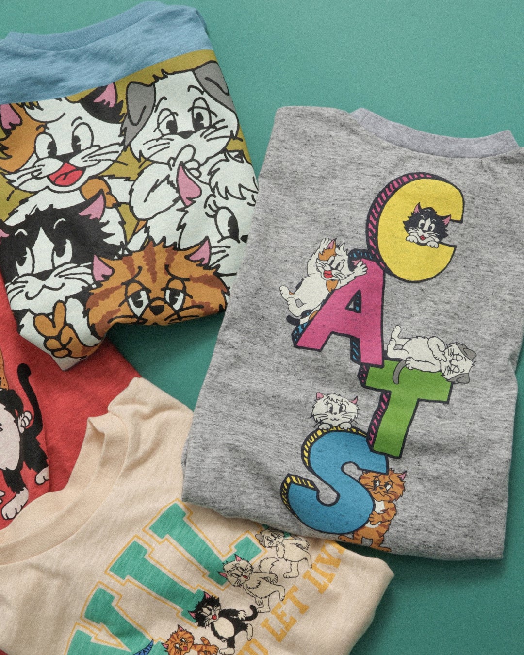 ネコたちがプリントされた、見ているだけで楽しくなるデザイン。表情豊かなキャラクターたちがレトロな質感のTシャツに。