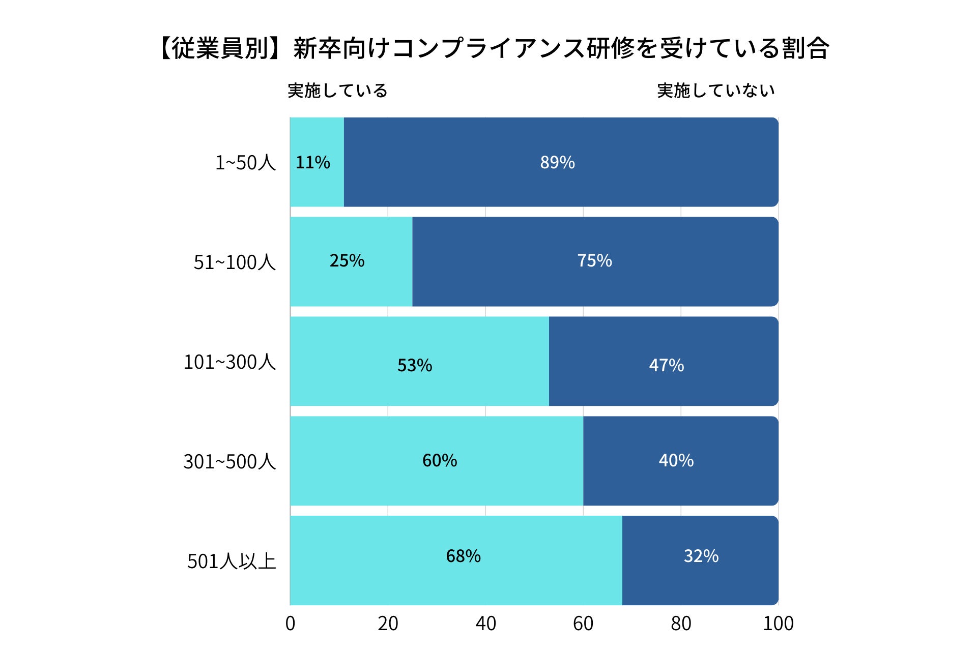 従業員数別にみてみると100人以下の企業は新卒社員に向けたコンプライアンス研修実施率が半分を切っているのに対し、501人以上の企業は実施率68%と高い。