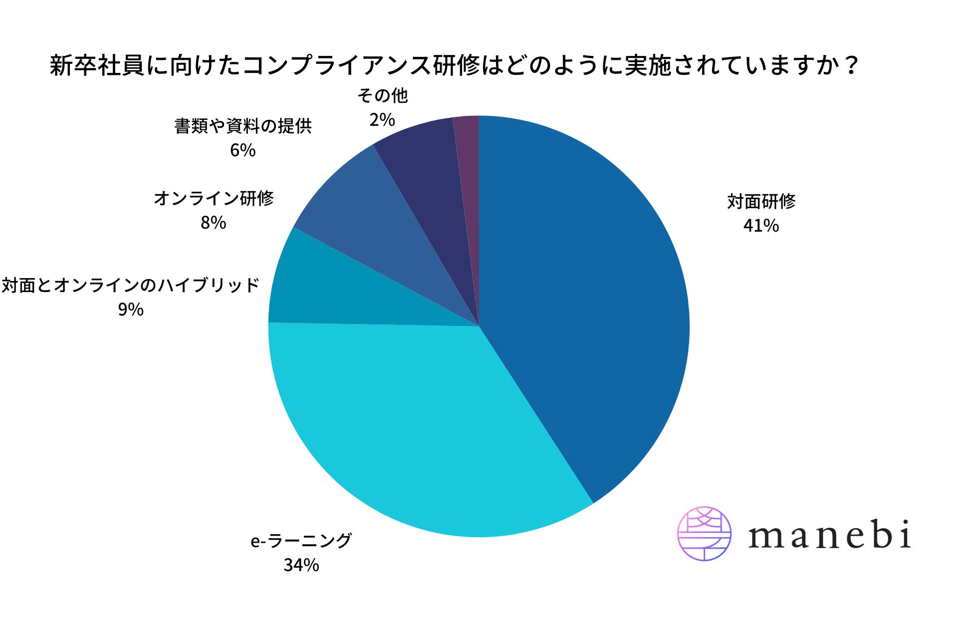 新卒社員に向けたコンプライアンス研修の方法として、eラーニングで行う企業が34.3%、対面研修で行う企業が40.7%となり、この両者が主流となっていることがわかった。