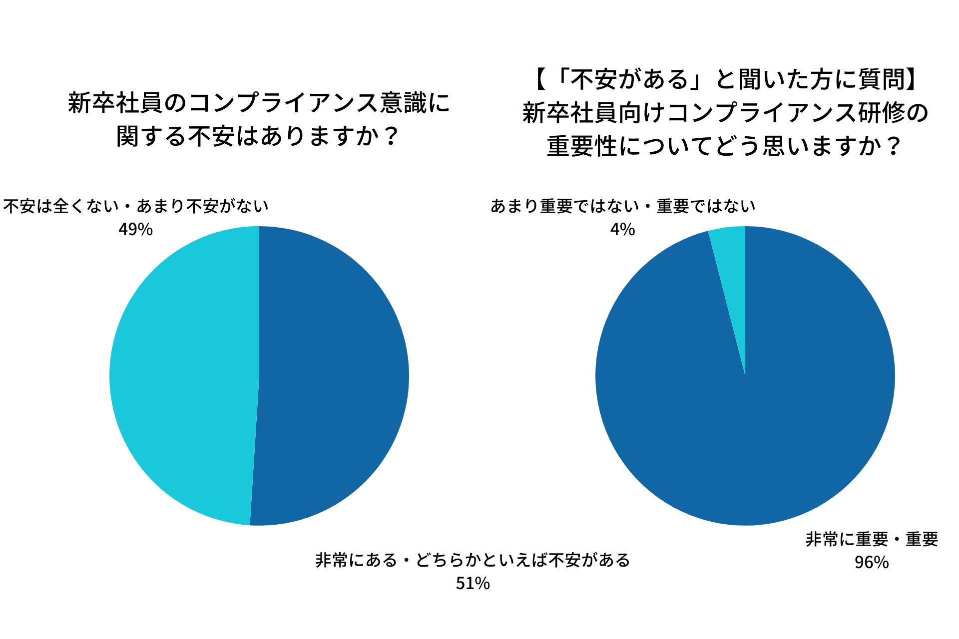 新卒社員のコンプライアンス意識に不安を抱く人は全体の約半数で、そのうちの96%が新卒社員向けコンプライアンス研修の重要性を認識していた。