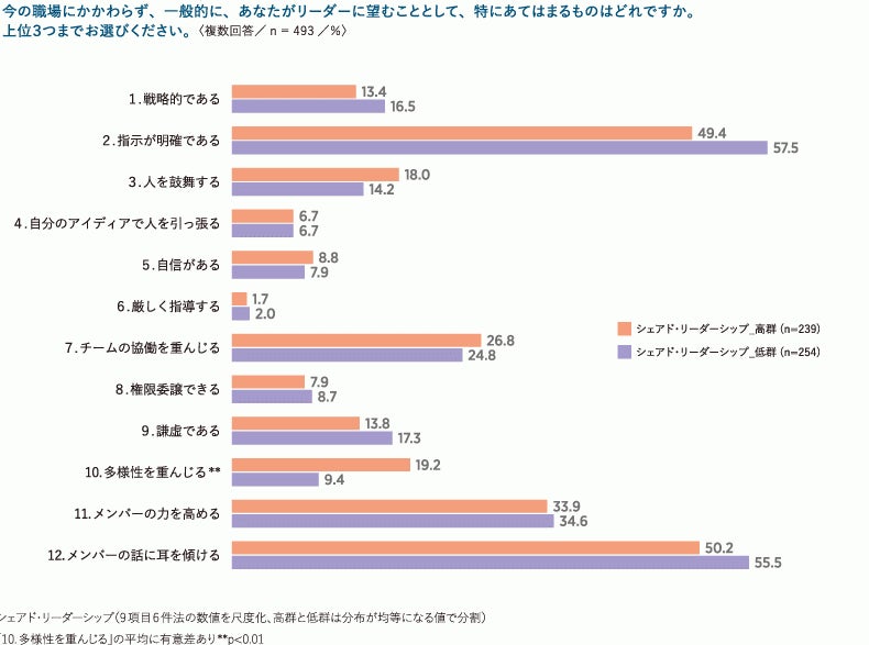 ・シェアド・リーダーシップ高群、低群ともに、「2.指示が明確である(高群49.4%、低群57.5%)」「12.メンバーの話に耳を傾ける(高群50.2%、低群55.5%)」の項目が高かった。シェアド・リーダーシップの発揮が高い職場でも、そうでない職場と同様、リーダーに対して、「明確な指示を出すこと」と「メンバーの話を傾聴すること」の両方が望まれているという結果は、先の『変革型』『支援型』『統率型』リーダーシップがいずれもシェアド・リーダーシップを促進する、との結果と呼応する。