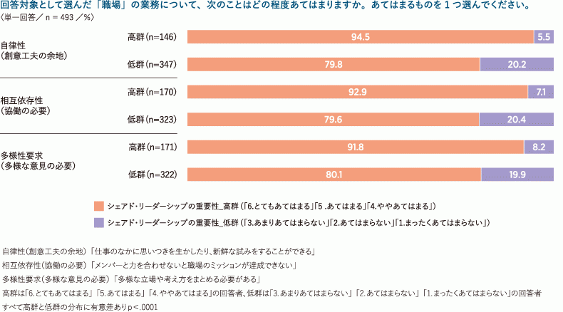 ・職場で主に行われる職務の特徴として、「自律性(創意工夫の余地)」「相互依存性(協働の必要)」「多様性要求(多様な意見の必要)」が高いと回答(6段階中「6.とてもあてはまる」「5 .あてはまる」「4.ややあてはまる」を選択)した高群は、そうでない低群と比べて、シェアド・リーダーシップが重要だと考える割合が有意に高く、「とてもあてはまる+あてはまる+ややあてはまる」が、9割を上回った。