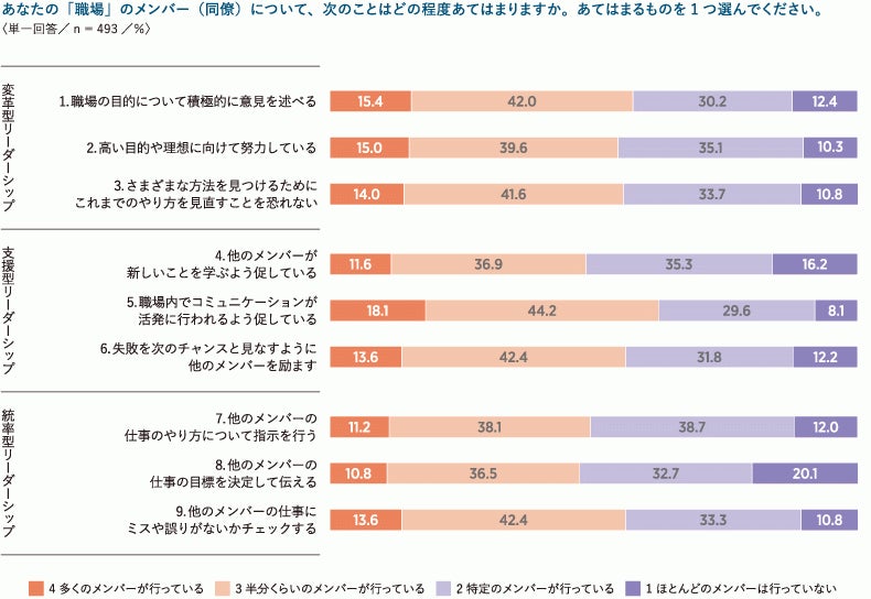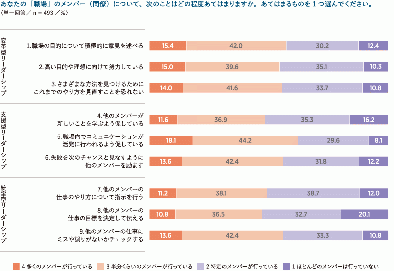 ・9項目のうち、自職場の半分以上の人が行っている(「4.多くのメンバーが行っている」+「3.半分くらいのメンバーが行っている」)割合が多かったのは支援型リーダーシップの「5.職場内でコミュニケーションが活発に行われるよう促している(62.3%)」、次いで変革型リーダーシップの「1.職場の目的について積極的に意見を述べる(57.4%)」、統率型リーダーシップの「9.他のメンバーの仕事にミスや誤りがないかチェックする(56.0%)」だった。上位3つが、3種類のリーダーシップそれぞれに該当し、メンバーのリーダーシップにも、さまざまなタイプがあることが分かる。