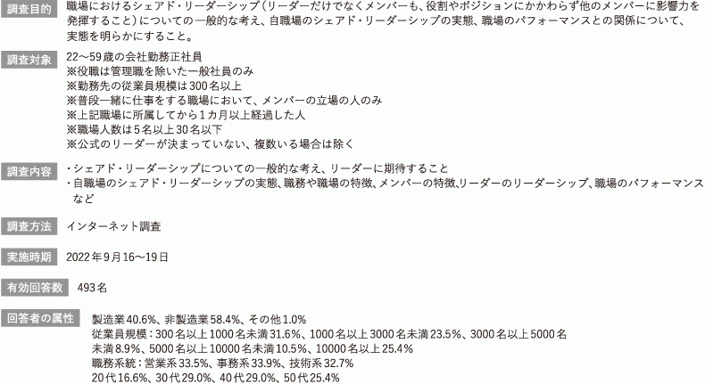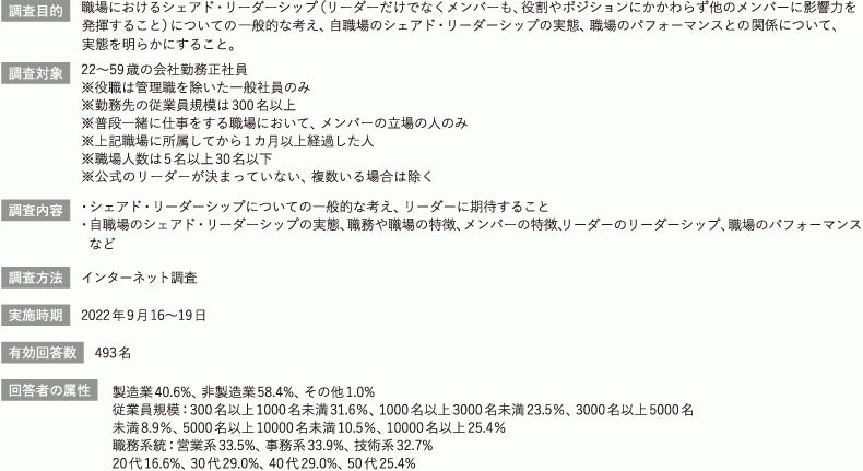 企業における経営・人事課題の解決および、事業・戦略の推進を支援する株式会社リクルートマネジメントソリューションズ(本社:東京都品川区 代表取締役社長:山﨑 淳 以下、当社)は、新型コロナウイルスの発生以降、現在も同じ会社で勤務しており、従業員規模300 名以上の企業に勤務の正社員493 名に対し、2022年9月に「職場のシェアド・リーダーシップに関する実態調査」を実施し、その調査結果を公表しました。