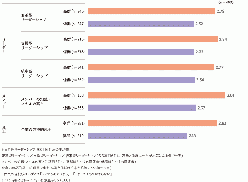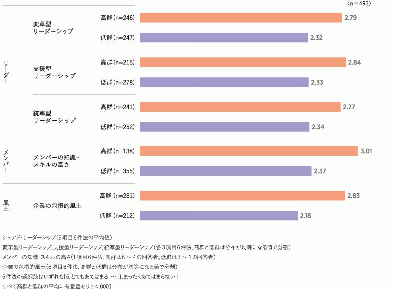 ・一方、メンバーにおいては、「保有している知識・スキルが総じて高い(単項目、6件法)」の高群、低群で、シェアド・リーダーシップの値に有意な差が見られた。それぞれのメンバーが知識・スキルを高めることは、シェアド・リーダーシップの発揮につながると考えられる。「異なる視点を大事にする文化がある」「従業員の意見を積極的に取り入れる」といった「企業の包摂的風土(6項目6件法)」も、高群、低群で、シェアド・リーダーシップの値に有意な差が見られた。