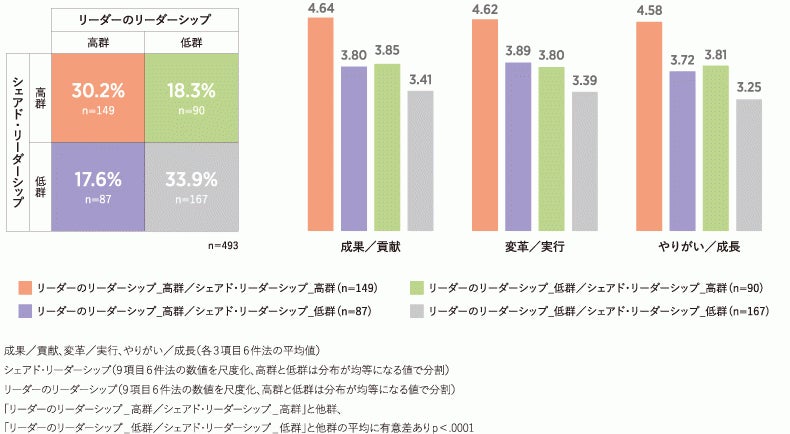 ・リーダーのリーダーシップの程度も加味して確認したところ、リーダー、メンバーともにリーダーシップが発揮された群(リーダー高/シェアド・リーダーシップ高 )は、『成果/貢献』『変革/実行』『やりがい/成長』のいずれにおいても、他群と比べ最も高い値を示した。