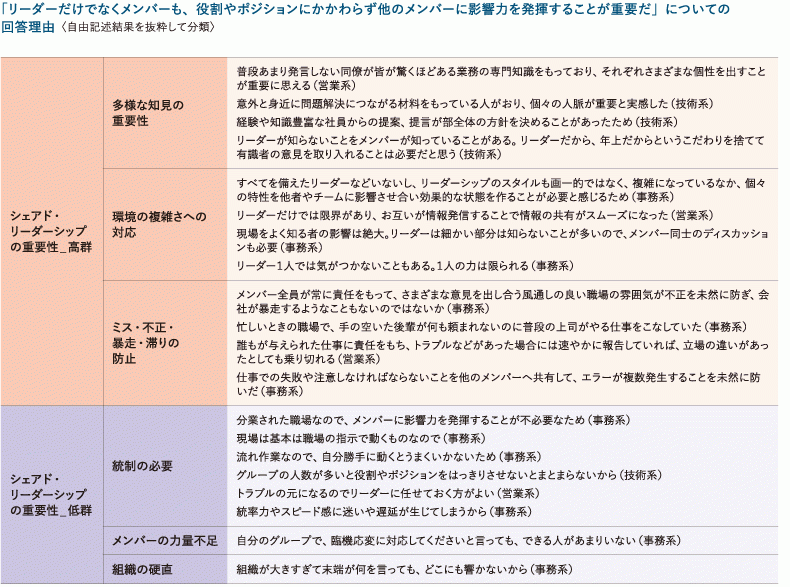 ・一方、シェアド・リーダーシップの重要性_低群の理由としては、「分業されているのでメンバーの影響力は不必要」「流れ作業なので勝手に動くとうまくいかない」などがあった。