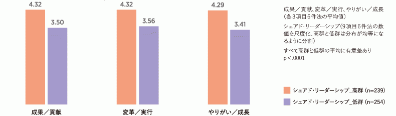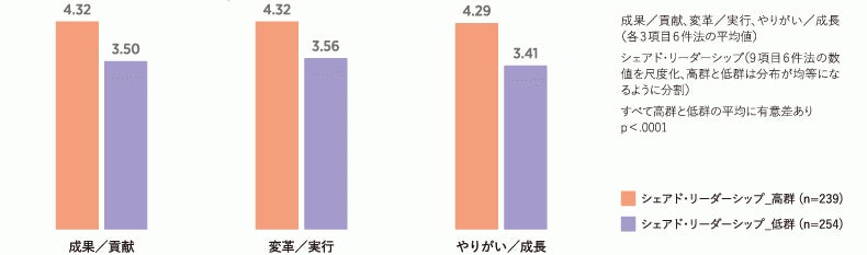 ・「会社が期待する以上の成果をあげている」「会社に重要な貢献をしている」など3項目による『成果/貢献』、「変化にうまく対応している」「決定事項が、すぐに実行に移される」など3項目による『変革/実行』、「メンバーは、職場の仕事にやりがいを感じている」「メンバーは、現在の職場で働くことを通して成長できると感じている」など3項目による『やりがい/成長』の値は、いずれも、シェアド・リーダーシップ高群と低群間に、有意な差が見られた。