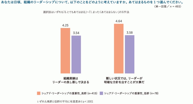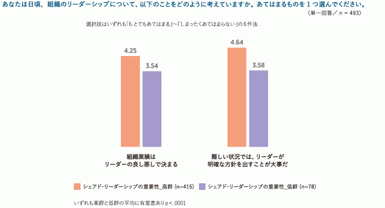 ・シェアド・リーダーシップの重要性についての回答の高群(「6.とてもあてはまる」「5 .あてはまる」「4.ややあてはまる」)と低群(「3.あまりあてはまらない」「2.あてはまらない」「1.まったくあてはまらない」)別に平均を見ると、「組織業績はリーダーの良し悪しで決まる」「難しい状況では、リーダーが明確な方針を出すことが大事だ」のいずれも、シェアド・リーダーシップの重要性_高群の方が有意に高い。