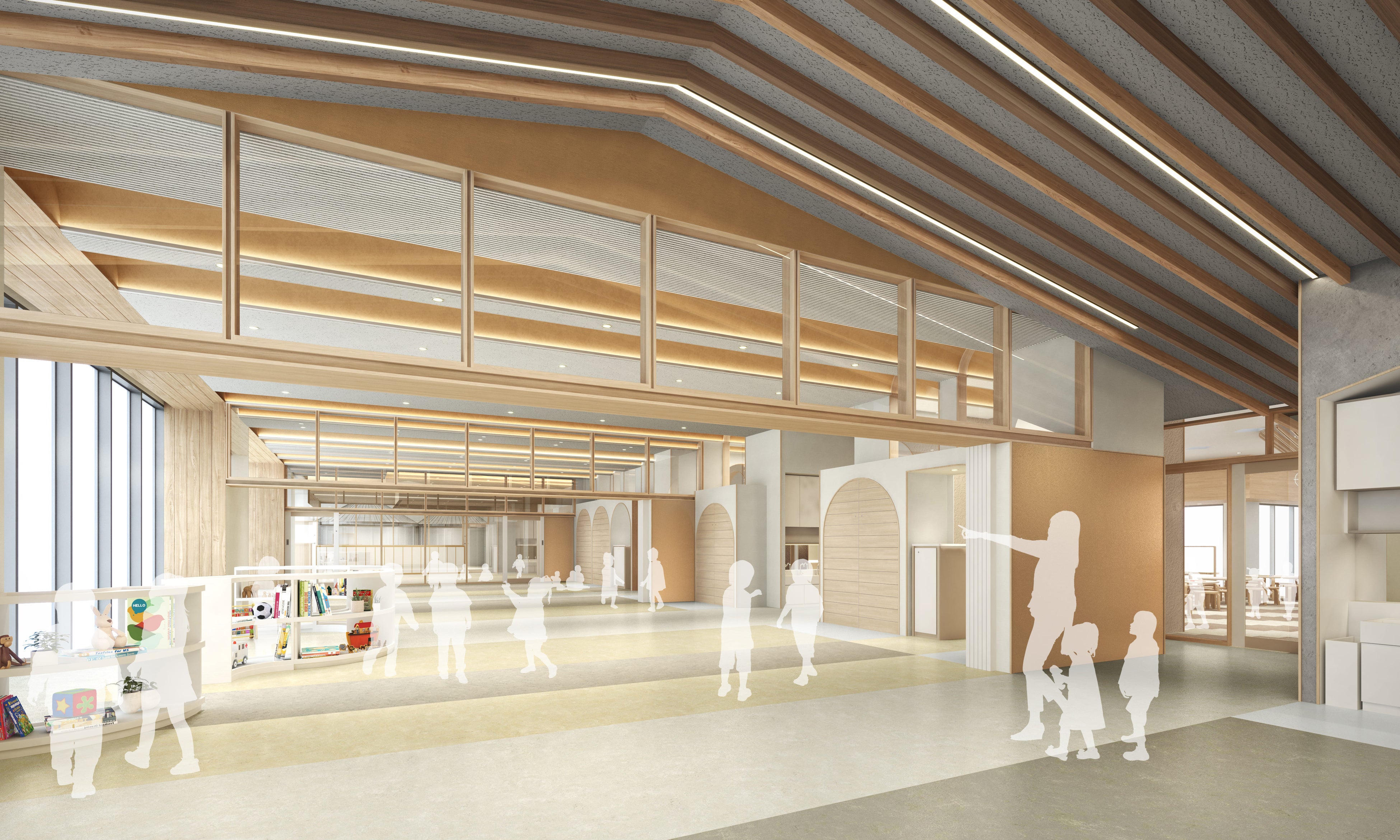 ・高天井を活かしたロフト、異年齢交流を促進するピアッツァ、多様な制作活動を可能にするアトリエ、知を蓄積するライブラリー等を設置