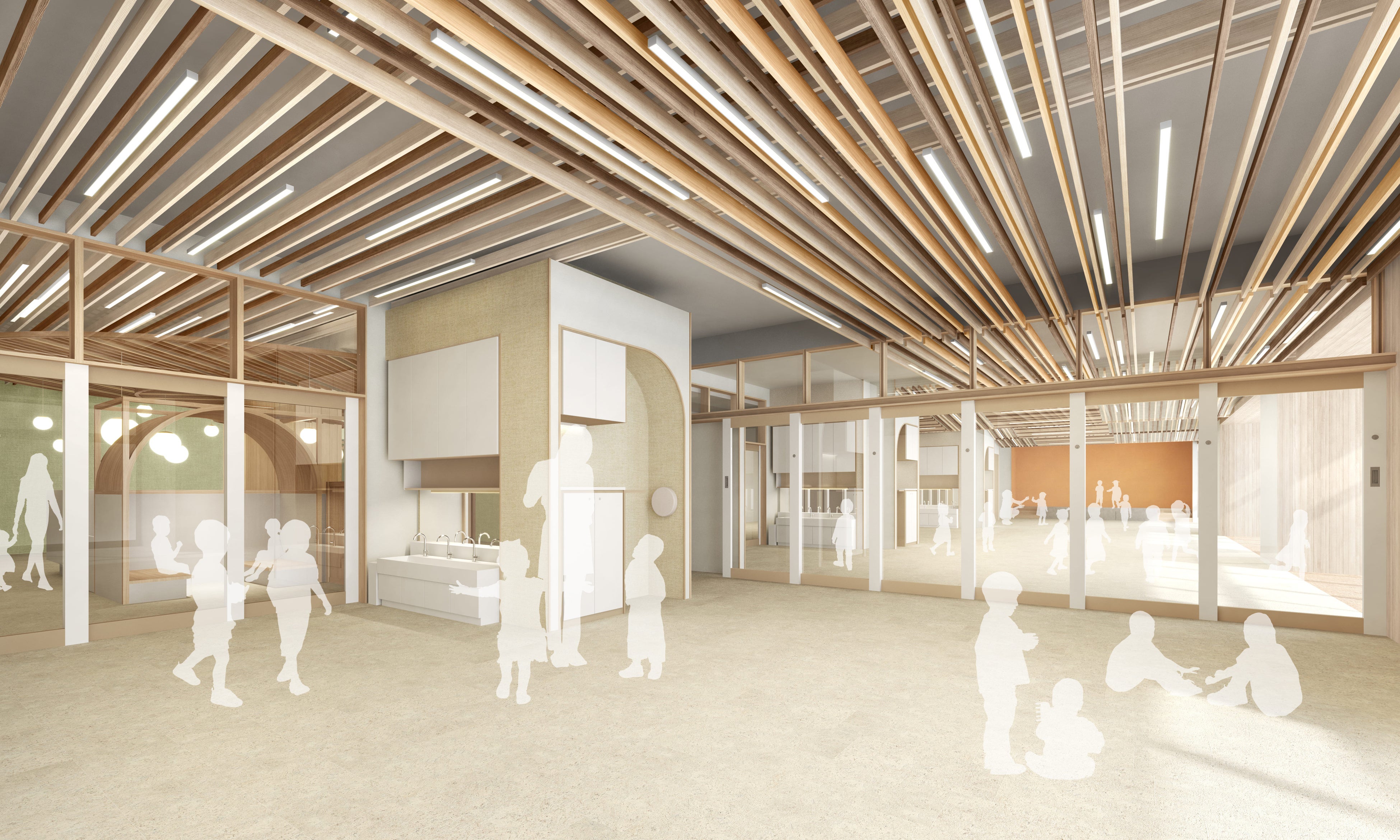 ・床材や天井の木材が保育室内と園庭を分け隔てなく横断する開放的なエデュケア空間