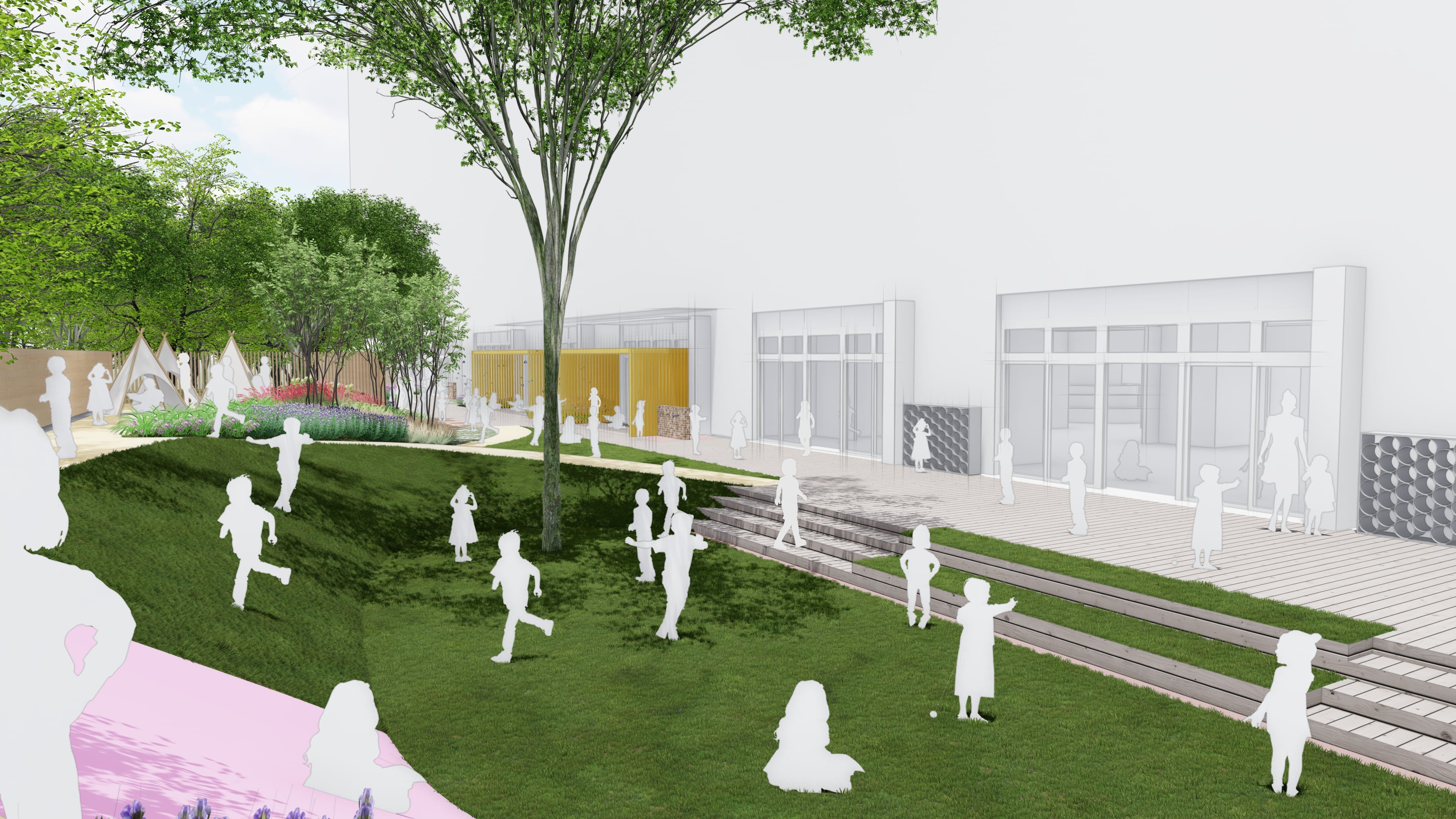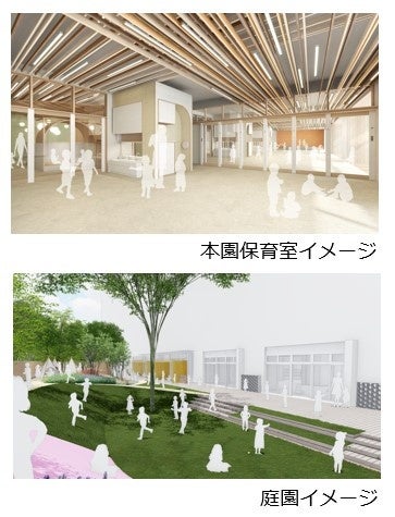 保育室に面した広い園庭を有する“はだしのにわ”をテーマにした緑の庭とが一体になった「Park Campus」