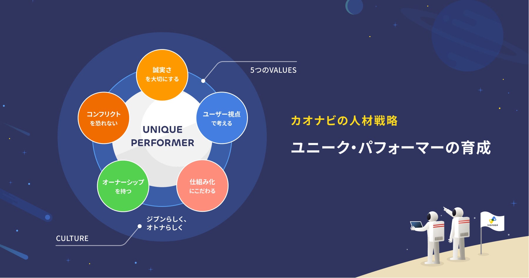 当社の人材戦略の核は、バリューを実践しカルチャーを体現する人材の育成です。これらの人材は、自己の能力を磨き続け、自律的に働き方を選択することで、他にはない(uni)成果を発揮する人材であり、「ユニーク・パフォーマー」と名付けています。
