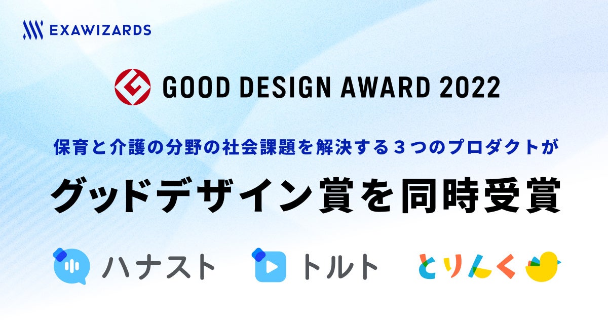 AIを利活用したサービスによる社会課題解決に取り組む株式会社エクサウィザーズ(東京都港区、代表取締役社長:石山 洸、以下エクサウィザーズ)と、子会社の株式会社エクサホームケア(東京都港区、代表取締役社長:石野 悟史、以下エクサホームケア)、株式会社VisionWiz(東京都港区、代表取締役社長:池知 慎一、以下VisionWiz)各社の3つのプロダクトが2022年度のグッドデザイン賞(主催:公益財団法人日本デザイン振興会)を同時に受賞しました。受賞対象となったのは、エクサウィザーズの介護音声入力AIアプリ「CareWiz ハナスト」、エクサホームケアのAI歩行解析ツール 「CareWiz トルト」、VisionWizの自動写真サービス「とりんく」です。この受賞を機に、社会課題解決に向けさらに邁進していきます。
