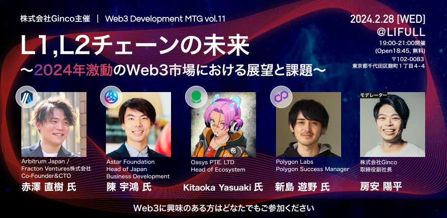 開催第11回目となる今回は、Arbirum Japanから赤澤 直樹氏、Astar Foundationから陳 宇鴻氏、OasysからKitaoka Yasuaki氏、Polygon Labsから新島 遊野氏をお迎えし、「L1,L2チェーンの未来〜 2024年激動のWeb3市場における展望と課題」と題したパネルディスカッションを行います。