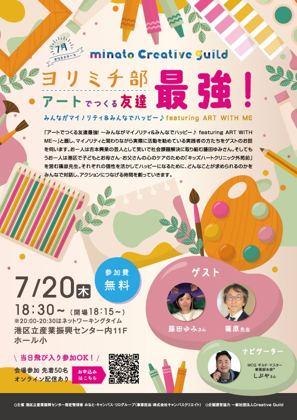 港区立産業振興センター(所在地:東京都港区)では、7月20日にヨリミチ部 7月部会!「アートで作る友達最強! ~みんながマイノリティ&みんなでハッピー featuring ART WITH ME~」開催いたします。