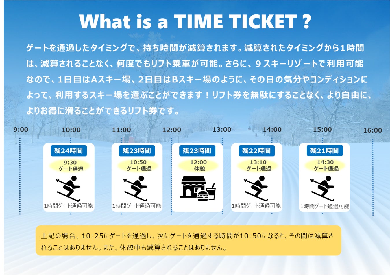 1時間単位で、リフト・ゴンドラにご乗車できるNSDグループ・パートナーリゾートにおける新サービスです。今回は25時間券と15時間券の2種類をご用意。ご利用方法としては、最初のゲート通過から1時間が経過した後に、ゲートを通過するまでを1時間と換算し、持ち時間が1時間減算されるという仕組みです。そのため、減算されるタイミングまで何度でもリフト乗車が可能となります。1時間を経過しても、滑走中や休憩中でゲートを通過することがなければ減算されることもありません。さらに、9スノーリゾートで利用可能なため、1日目はAスキー場、2日目はBスキー場のように、その日の気分やコンディションによって、利用するスキー場を選ぶことができます。リフト券を無駄なく、より自由に、よりお得に滑ることができるリフト券です。