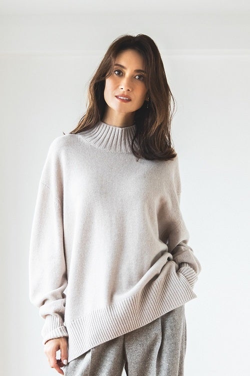 ボディラインを拾いにくい程よくゆとりのあるシルエットでありながら、袖口や裾のリブ巾をやや広めに取ることで、全体がコンパクトな印象のハイネックニットです。