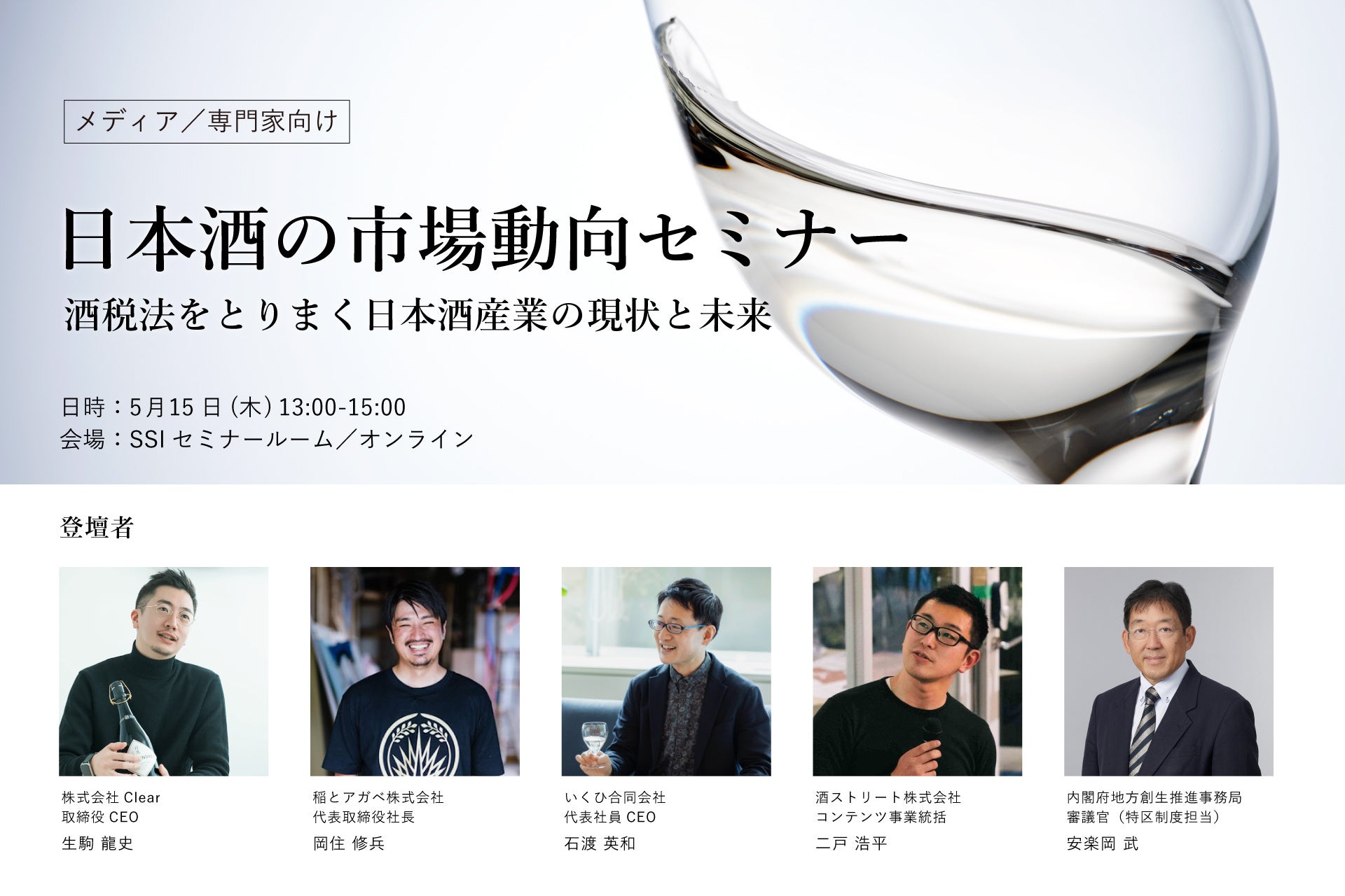 日本酒ブランド「SAKE HUNDRED(サケハンドレッド)」を運営する株式会社Clear(東京都渋谷区 代表取締役CEO:生駒龍史)は、メディアおよび日本酒専門家向けの日本酒市場動向セミナー「酒税法をとりまく日本酒産業の現状と未来」を、酒ストリート株式会社協力、NPO法人日本酒サービス研究会(SSI)後援のもと、5月15日(木)に主催します。本セミナーでは、社会環境が大きな変化に直面するなかで、産業の発展のために必要な転換への模索を、ベンチャー企業、酒蔵、元国税局主任鑑定官の酒類アドバイザー、規制改革を担う内閣府、それぞれの立場にある担当者を招き解説します。