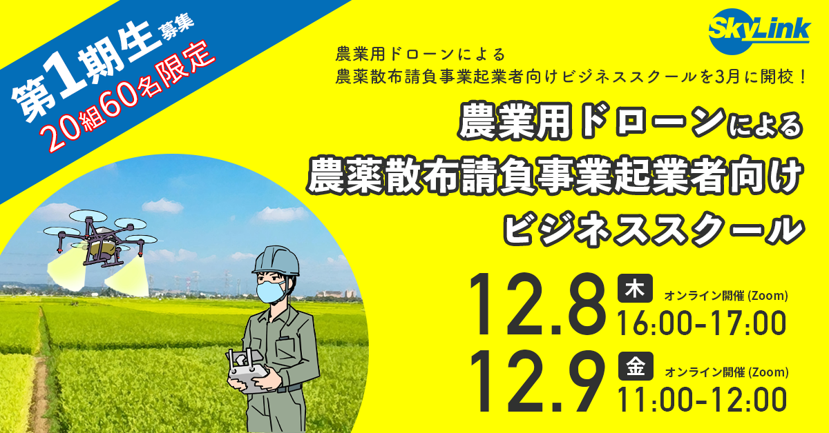 第一期生募集にあたり、12/8(木)および12/9(金)に『あなたのビジネスを最短で成功に導く“農業ドローンによる農薬散布請負事業起業者向けビジネススクール"』と題した無料WEBセミナーを実施します。