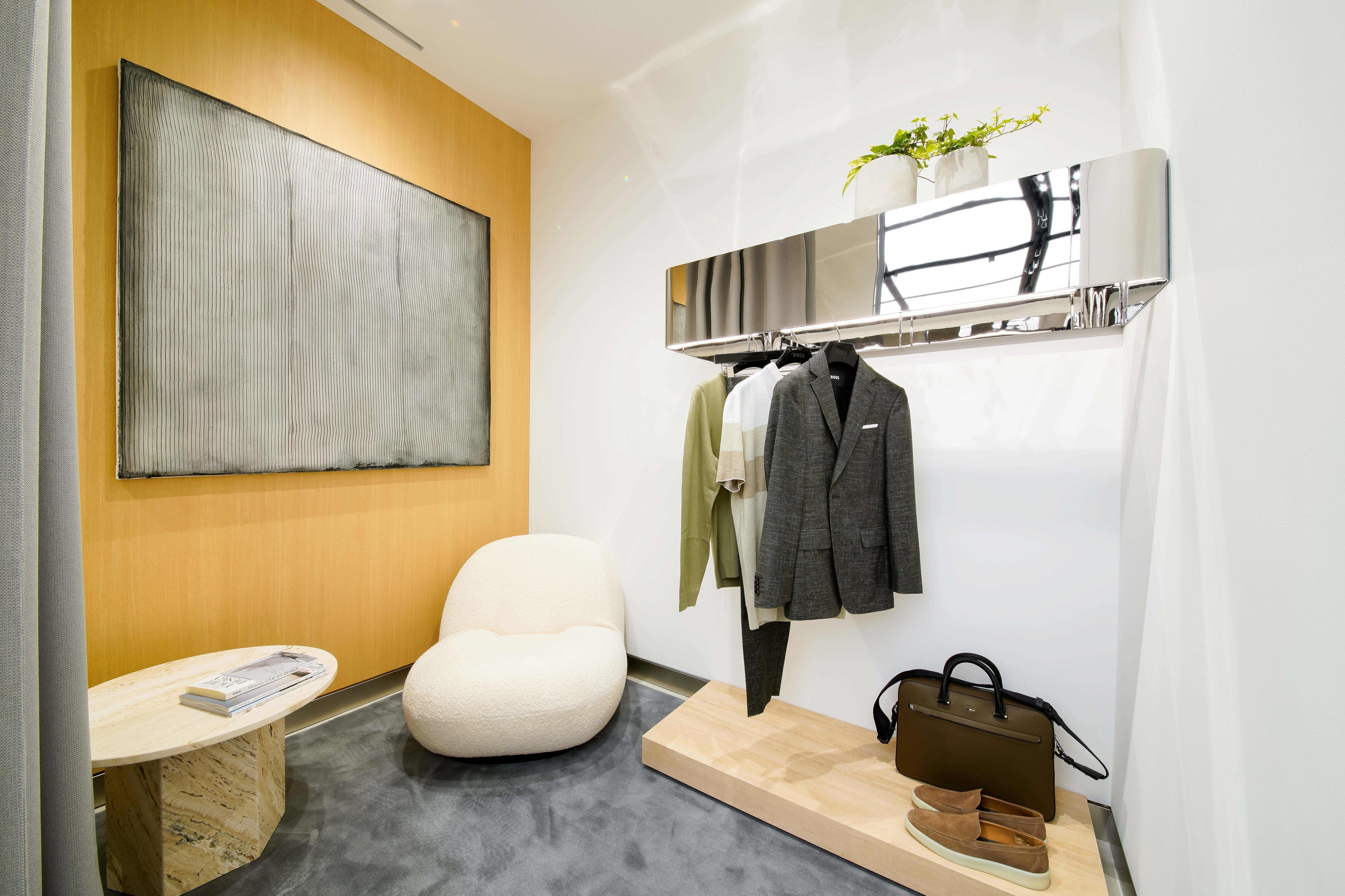 店内へと足を運ぶと、BOSSの最新キャンペーン動画が映し出される、インパクトのある大型LEDファサードで迎えられます。木製のフローリング、トラバーチン、メタリックシルバーの什器に温かみのある素材を使用し、黒の大理石や光沢のあるマテリアルを組み合わせることで、刷新したビジュアルアイデンティティが店舗建築にシームレスに融合。IGARASHI DESIGN STUDIOが手掛けた「和」から着想を得た「墨」を表現したカーペットが店舗に一体感をもたらしています。カラーパレットが店舗全体のバランスを完璧に調和し、温かみのある洗練された雰囲気を醸し出しています。