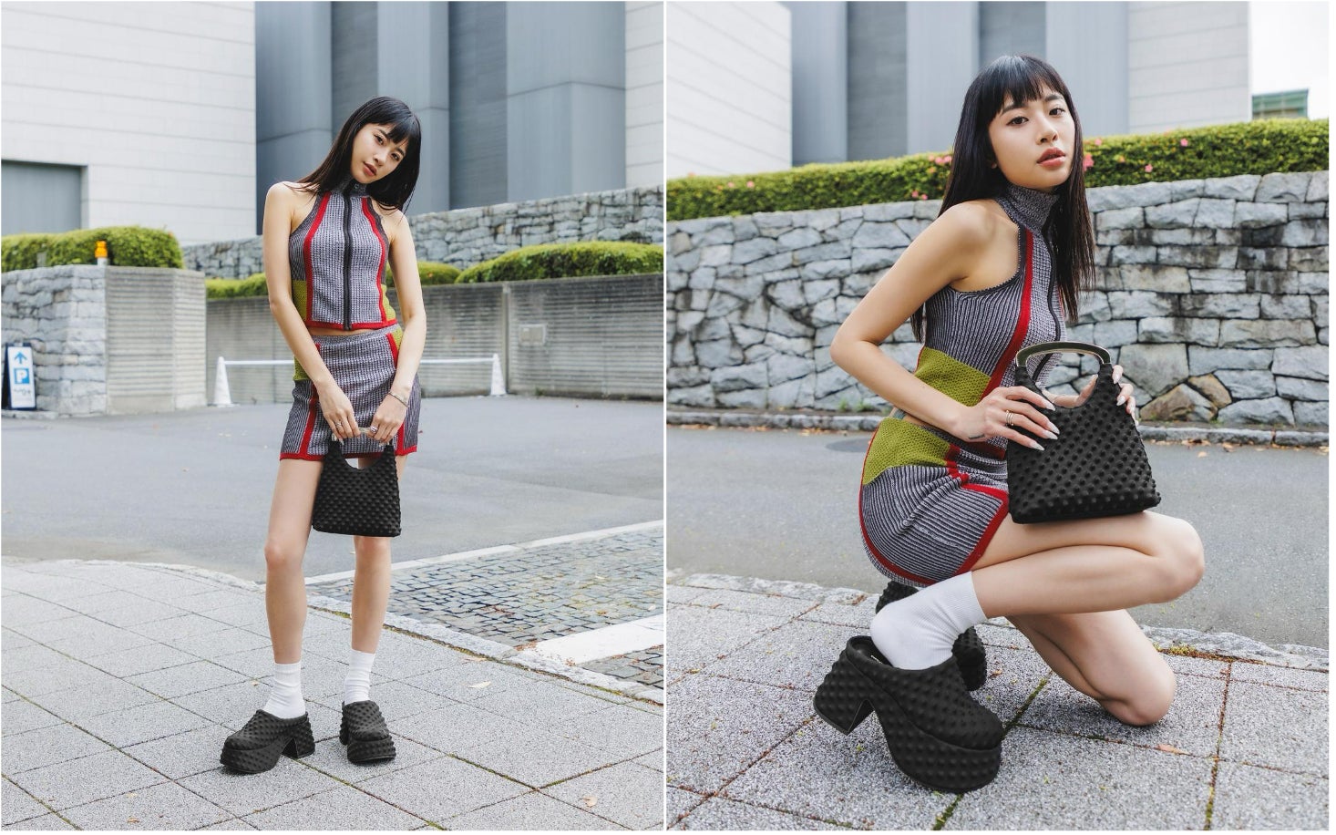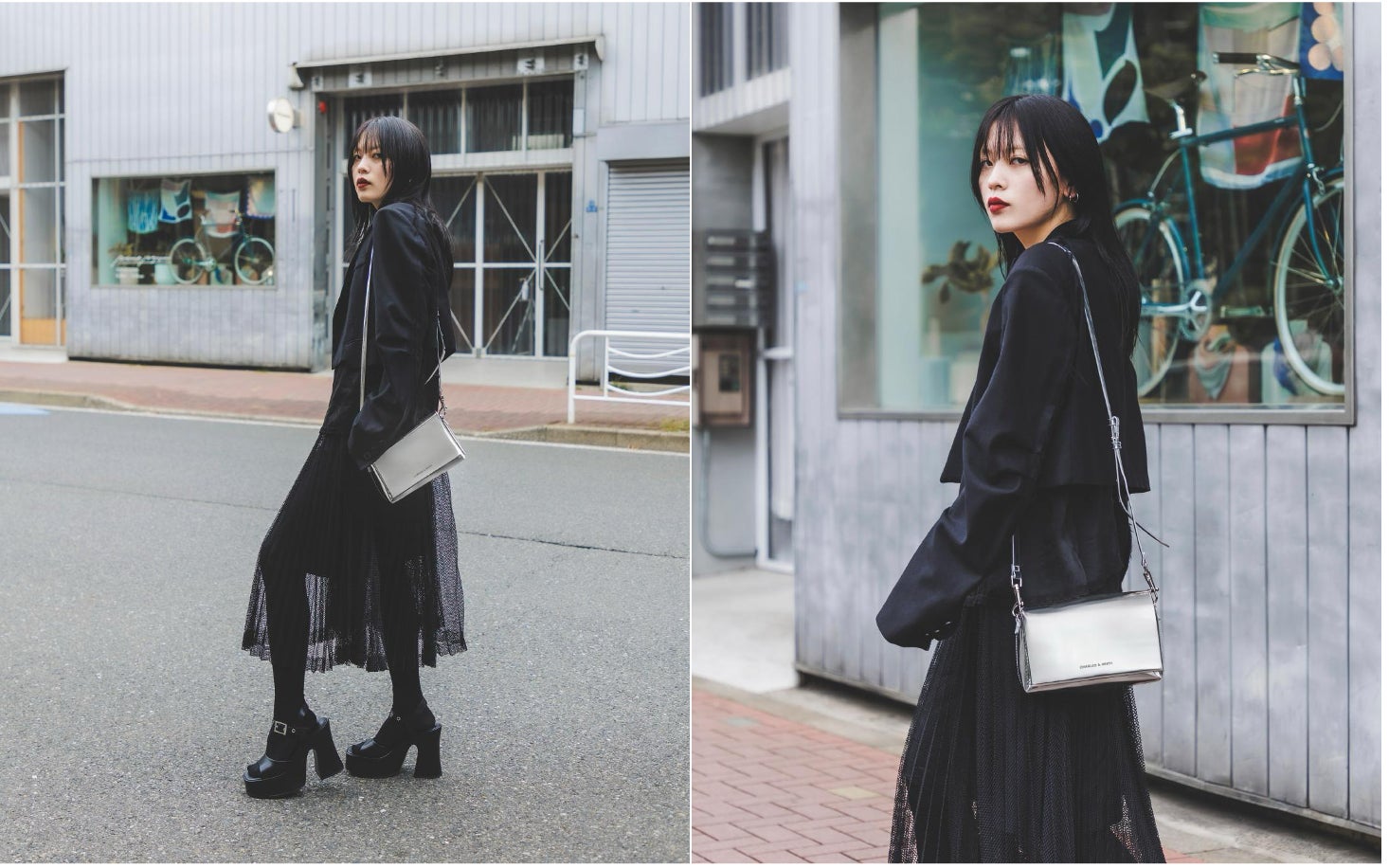 エッジィな雰囲気を纏うモデルの青木紅巴さんは、まるでミラーのような輝きを放つクロスボディバッグと、大胆なプラットフォームが存在感を放つサンダルで彼女らしいコーディネートを完成させて。