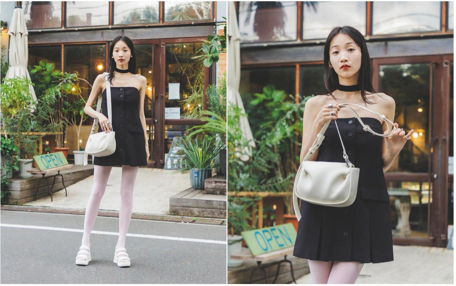 シックなリトルブラックドレスに、白いアイテムが映えるコーディネートを披露した清水こづえさん。