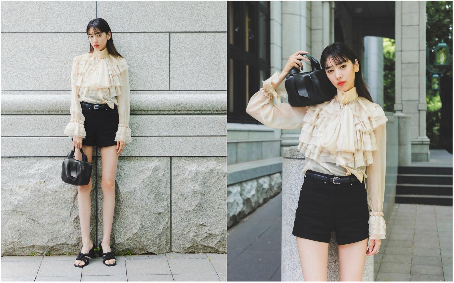 エレガントなラッフルブラウスと、ブラックのショートパンツに、素材やディテールで遊び心を効かせたアイテムをプラスしたモデルの晶さん。