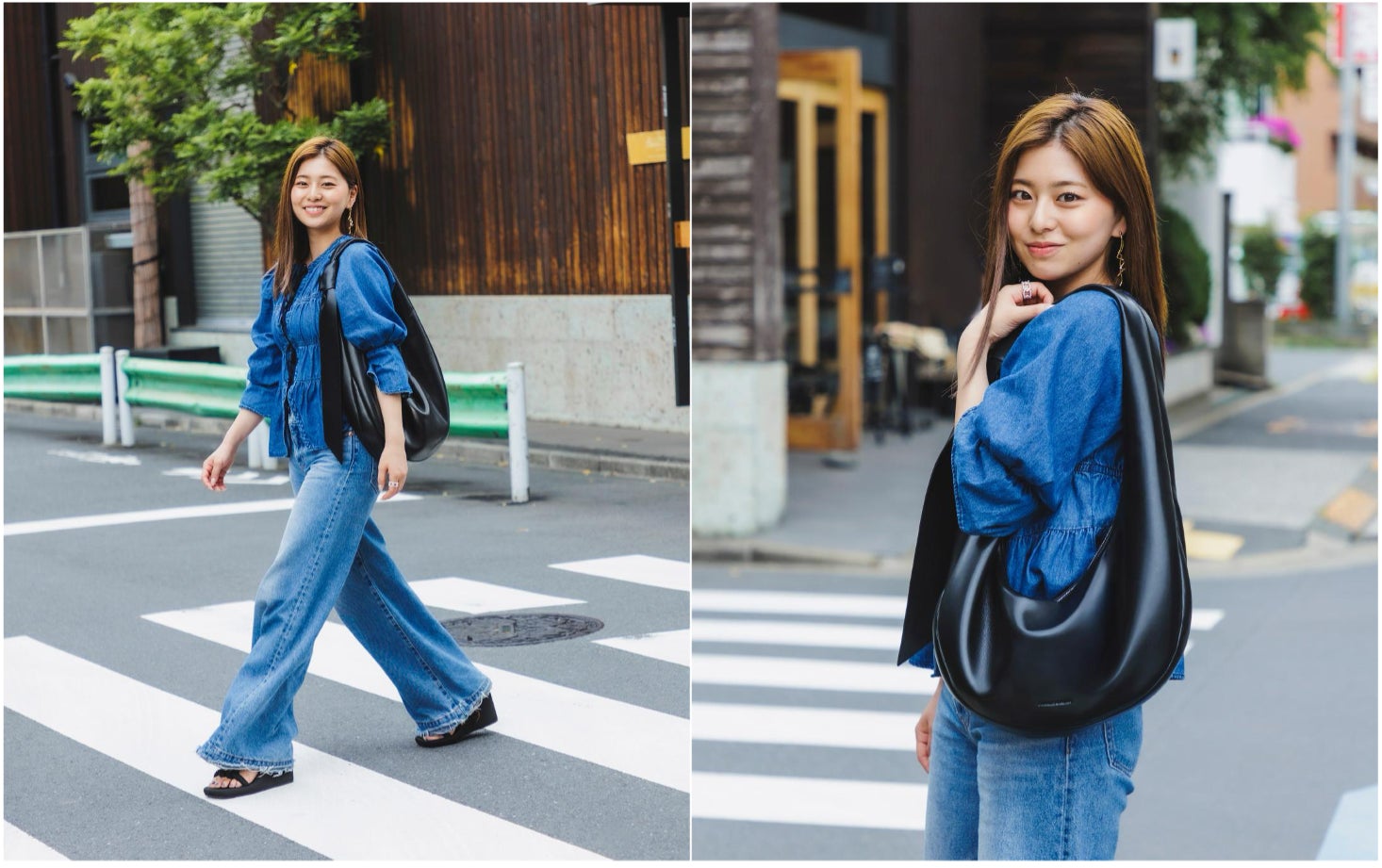 モデルの兼清萌々香さんは、デニムセットアップにBlackカラーのToni シリーズをチョイス。