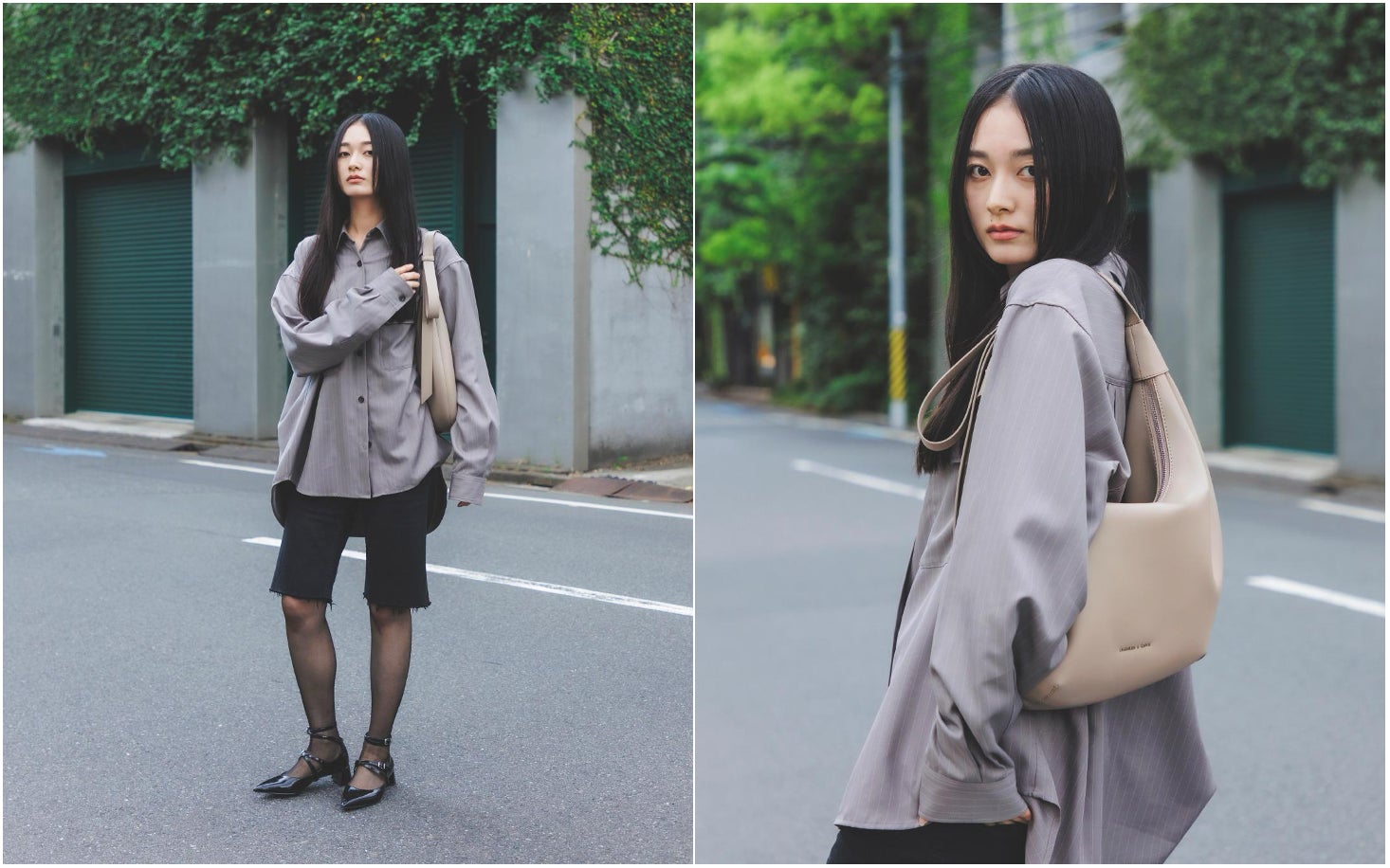 ニュートラルカラーのブラウスに、同じニュートラルカラーのホーボーバッグをセレクトしたモデルのFumika Kitaniさん。