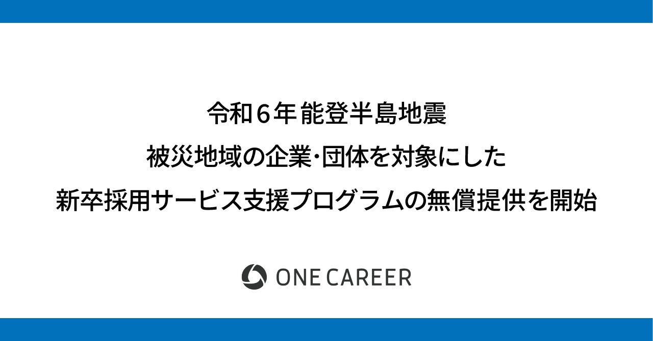 キャリアデータプラットフォーム事業を運営する株式会社ワンキャリア(本社:東京都渋谷区、代表取締役社長 執行役員CEO:宮下 尚之、東証グロース:4377、以下ワンキャリア)は、令和6年能登半島地震により災害救助法が適用された地域に所在し、かつ災害救助法適用地域内にて被害を受けた企業・団体を対象に、新卒採用サービスを無償でご利用いただける支援プログラムを本日から開始します。