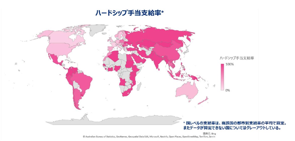 派遣元との生活環境差に対する企業独自の配慮として設定されるハードシップ手当は、北米や欧州への手当支給率が低い一方で、アジア・ロシア・南米・中東・アフリカ地域への支給率は高い(グレーアウトされている国はデータ収集がなかった国)。