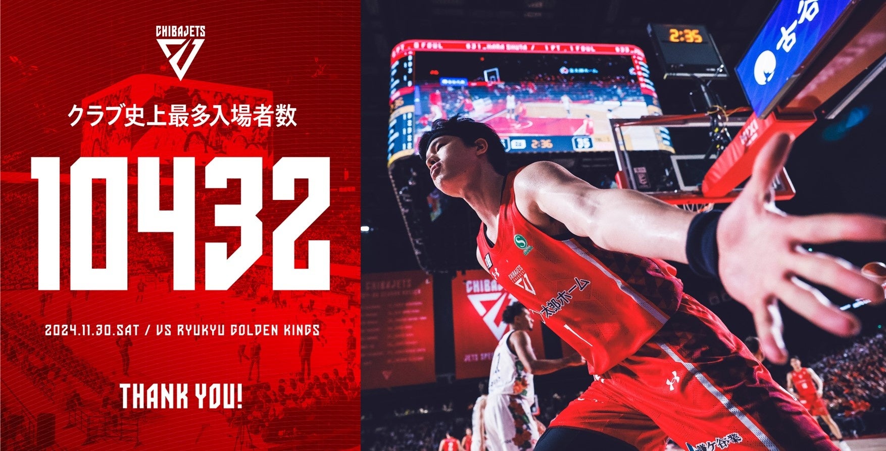 千葉ジェッツは11月30日(土)に南船橋「ららアリーナTOKYO-BAY」にて、りそなグループ B.LEAGUE 2024-25 SEASON 第 9 節 千葉ジェッツ VS 琉球ゴールデンキングスを開催し、【10432人】を動員しクラブ史上最多動員数をさらに更新いたしました。この日のゲームでは元NBA選手である渡邊雄太が怪我から復帰。琉球を相手に77-65で勝利し、記録更新に花を添えた。
